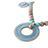 Spektakuläre verstellbare Halskette aus schwarz lackierten Holzperlen mit einer zentralen Anordnung mit Details aus geschnitztem Knochen, einer länglichen Holzperle und einem matt vergoldeten Zamakring, die dieses Stück ideal zum Kombinieren mit Ihrem Lieblingslook machen.