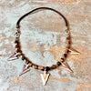 Lange verstellbare Halskette aus braunem Leder, großes versilbertes Zamak-Medaillon, Harzperlen (Bambus und facettiertes Holz) und versilberte Zamak-Kugeln.